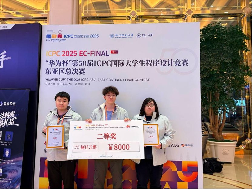 2026年1月31日-2月2日,“华为杯”第 50 届 ICPC 国际大学生程序设计竞赛东亚区总决赛在杭州师范大学落下帷幕,本次大赛有北京大学、清华大学、上海交通大学等东亚地区138所高校,280支队伍参赛。我校ACM战队历经亚洲区域赛成都站、沈阳站选拔,最终有1支队伍获得亚洲区决赛资格。在亚洲区决赛场上,我校选手历经5个小时的激烈竞争,最终由董柯演、张皓宇、章振杰三位同学组成的队伍获得本次比赛银奖,其中,我校排名为全国第41,上海市高校第三,并在同步进行的华为挑战赛中获得全国二等奖,这也是我校参加该项赛事以来,首次校排名进入全国前50,创下我校参加该项赛事取得的最好成绩。